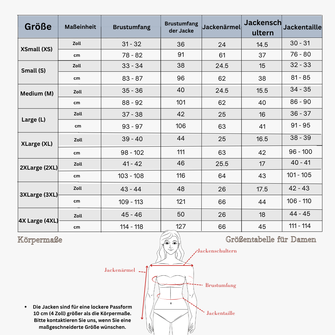 Warum sich mit einer Standardpassform zufriedengeben? Für eine wirklich perfekte Silhouette teilen Sie uns bitte Ihre Körpermaße (Schulterbreite, Brustumfang, Taillenumfang und Ärmellänge) per E-Mail oder im Abschnitt „Bestelldetails“ mit. Wir passen es speziell für Sie an – ohne Aufpreis.