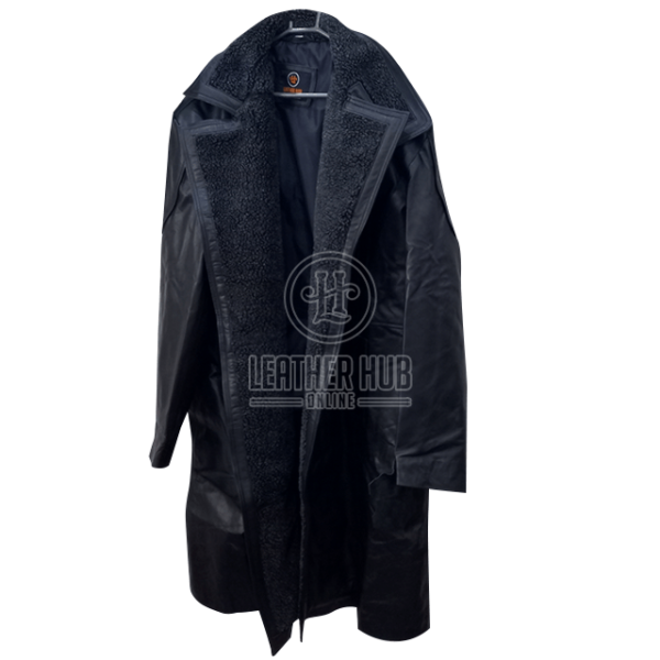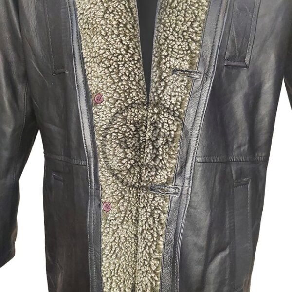 Erleben Sie den faszinierenden Reiz von Officer Ks Kleidung mit diesem sorgfältig gefertigten Ledermantel. Hergestellt aus hochwertigem Lammleder mit einem dezent gealterten Finish, vereint er eine imposante Silhouette mit luxuriöser Wärme dank seines umfangreichen Shearling-Futters. Ziehen Sie alle Blicke auf sich und trotzen Sie den Elementen im Stil von Blade Runner.