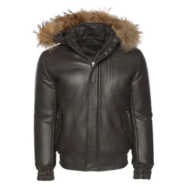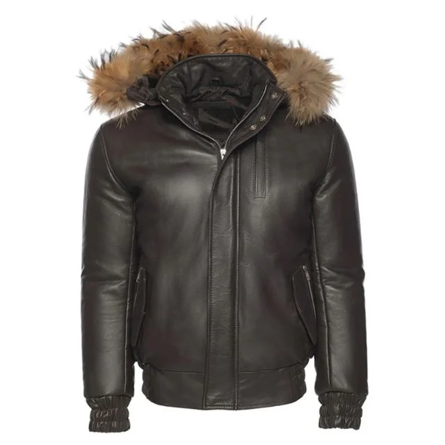 Ergänzen Sie Ihre Kollektion noch heute mit dieser exquisiten braunen Herren-Bomberjacke aus Leder mit Kapuze!
