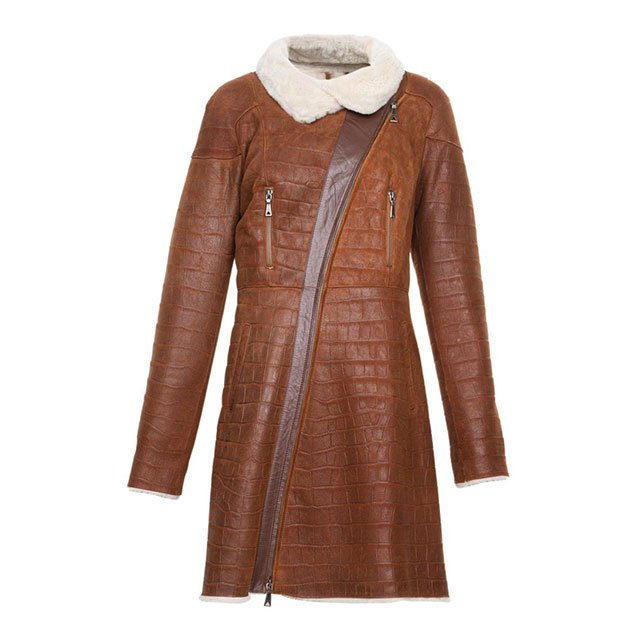 Fügen Sie Ihren langen, braunen Ledermantel mit Shearling-Besatz noch heute Ihrem Warenkorb hinzu!