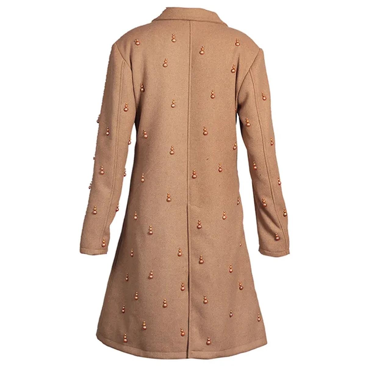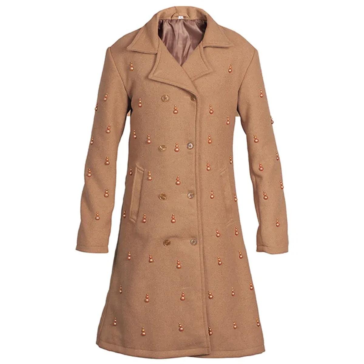 Erleben Sie unvergleichlichen Stil mit unserem braunen, verzierten Woll-Trenchcoat für Damen. Gefertigt aus einer hochwertigen Wollmischung, bietet dieser Trenchcoat außergewöhnliche Wärme und einen eleganten Fall – perfekt für jede Jahreszeit, insbesondere für den Winter. Das einzigartige, maßgeschneiderte Design und die exquisiten Details verleihen Ihnen eine Aura zeitloser Eleganz.