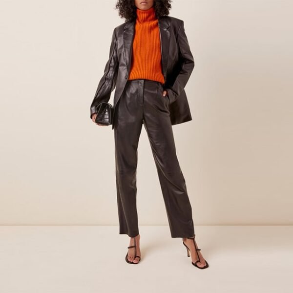 Erleben Sie unvergleichliche Eleganz mit unserem **schwarzen Designer-Lederblazer für Damen**. Gefertigt aus 100 % vollnarbigem Lammleder, bietet diese Jacke ein herrlich weiches Tragegefühl und eine raffinierte Ästhetik. Das sorgfältig geschneiderte Design sorgt für eine schmeichelhafte Passform, die Ihre Silhouette perfekt in Szene setzt und es zu einer unverzichtbaren Ergänzung Ihrer Business- und Freizeitgarderobe macht.