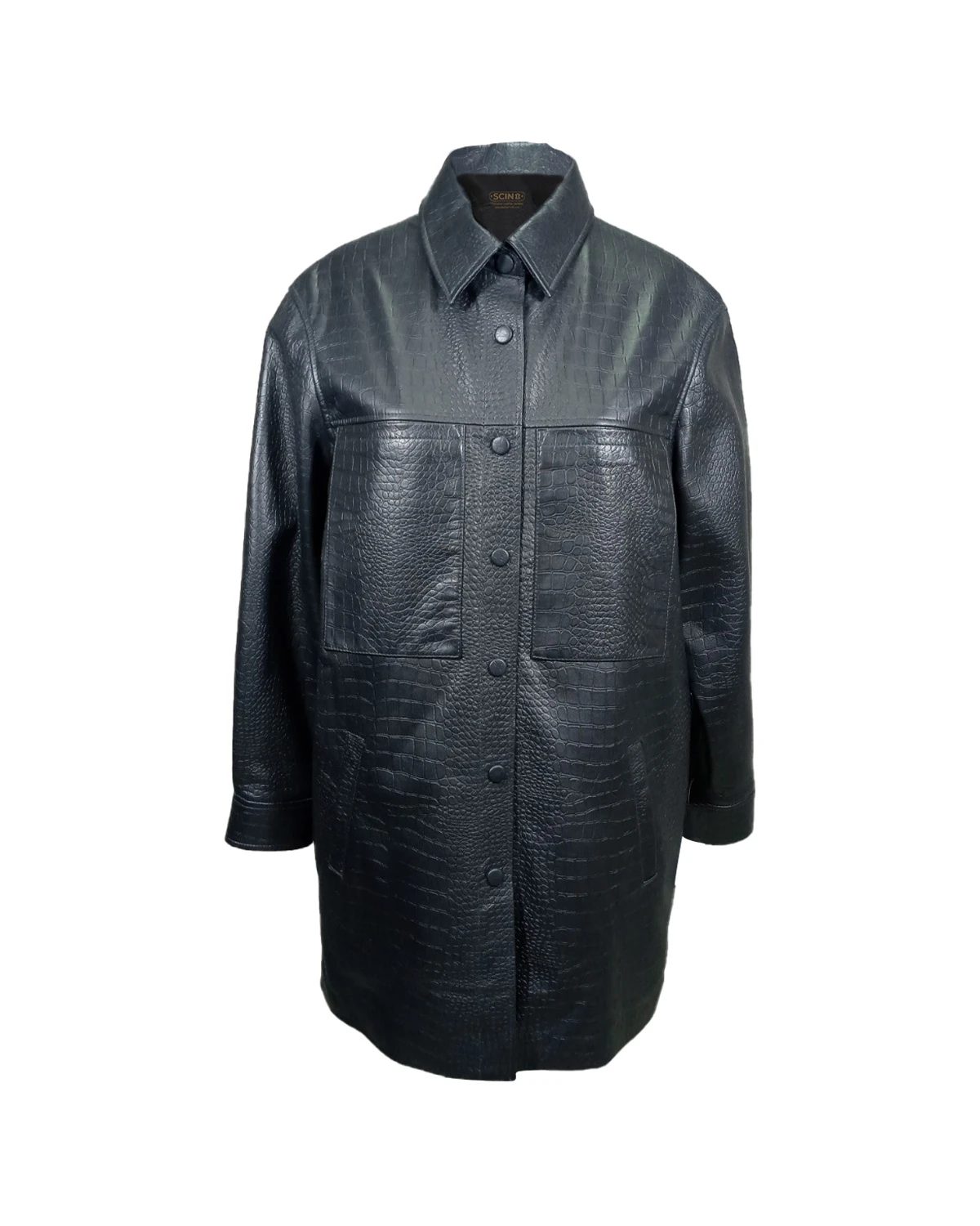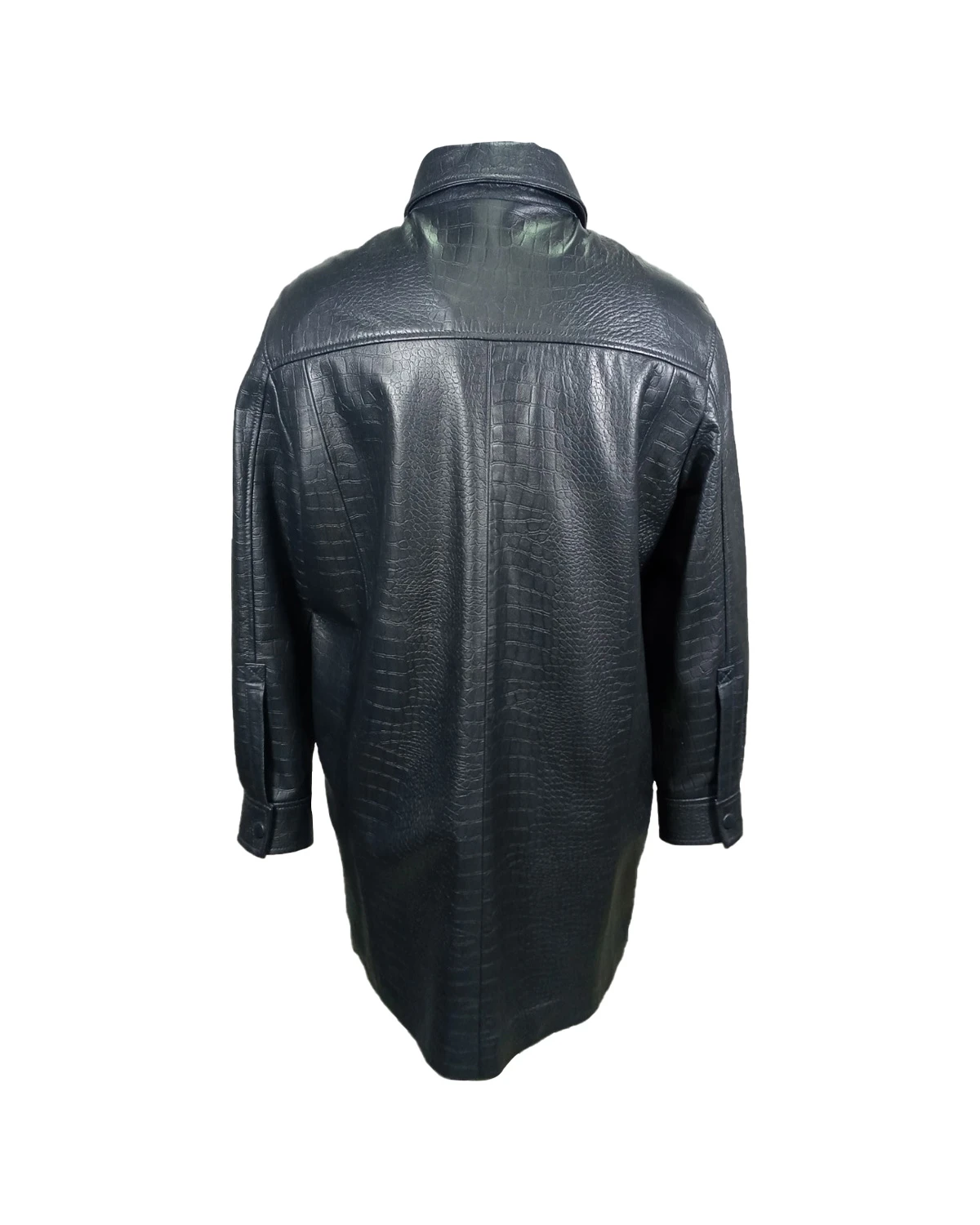 Das hochglänzende, krokodilgeprägte Schafleder verleiht einen luxuriösen Touch und verwandelt eine lässige Hemdjacke in ein Statement von Eleganz.