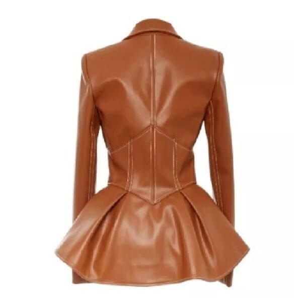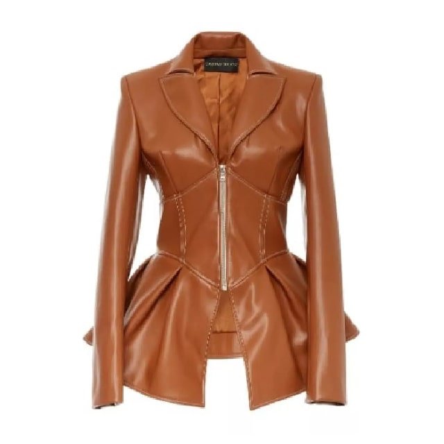 Diese raffinierte Lederjacke vereint Mehrere ikonische Modeelemente vereinen sich zu einem zeitgenössischen Meisterwerk. Das **Peplum**, ein kurzer, ausgestellter Rüschensaum an der Taille, schmückt Silhouetten seit dem antiken Griechenland und feierte in der viktorianischen Mode sowie in den Stilen der Mitte des 20. Jahrhunderts ein fulminantes Comeback, um Hüfte und Taille elegant zu betonen. Der **korsettartige** Schnitt ist modern und komfortabel und verweist gleichzeitig auf jahrhundertealte, strukturierte Kleidungsstücke, die die weibliche Form definieren und hervorheben.