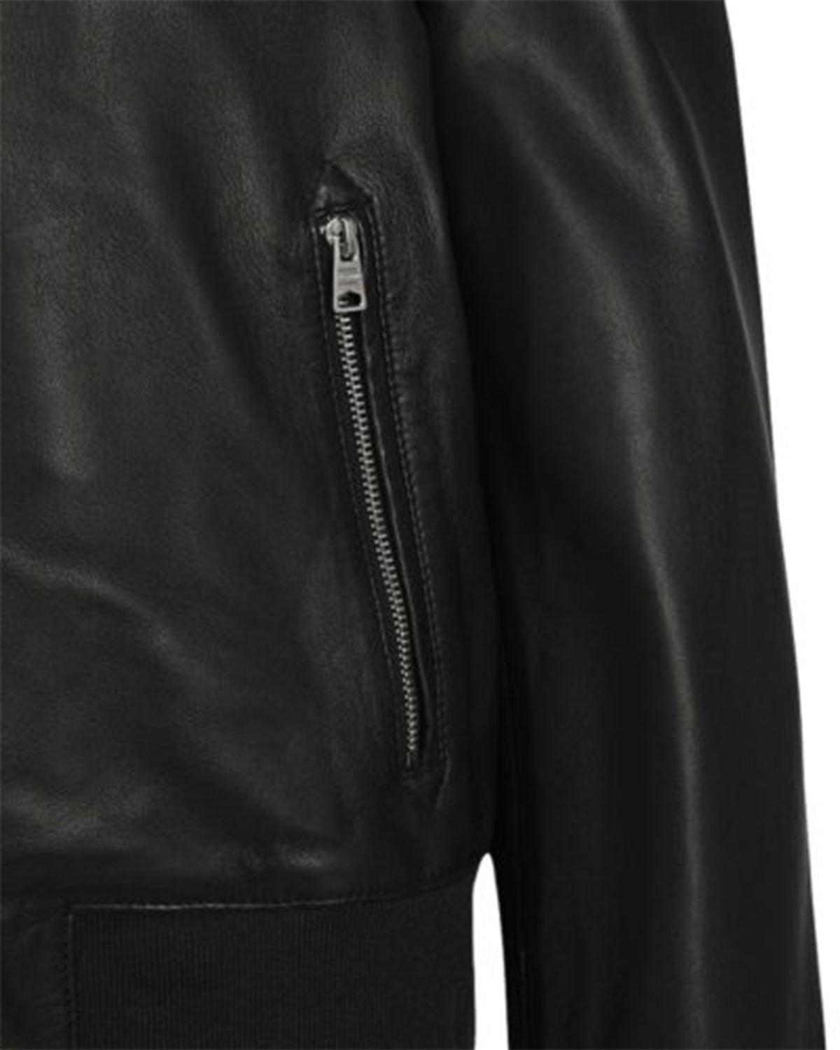 Der ikonische Rippstrickkragen, die Bündchen und der Saum sorgen für eine bequeme, eng anliegende Passform und bewahren gleichzeitig die klassische Bomberjacken-Silhouette. Das elegante schwarze Leder passt mühelos zu jedem Outfit.