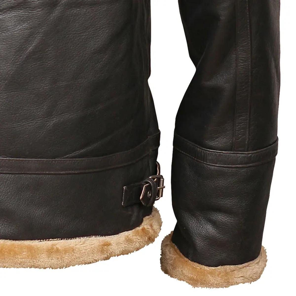 Das satte, tiefdunkelbraune Leder außen bildet einen wunderschönen Kontrast zum weichen, künstlichen Shearling-Innenfutter und schafft so ein optisch beeindruckendes und luxuriöses Kleidungsstück. Sein robuster Lammfellkragen mit doppelten Schnallenriemen bietet unvergleichlichen Nackenschutz und eine unverwechselbare, authentische Fliegerjacken-Optik.