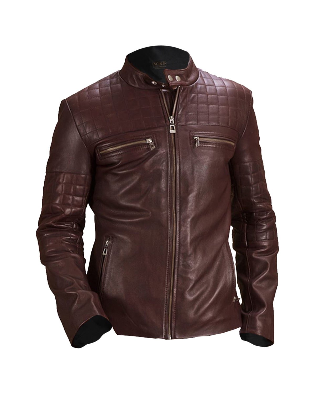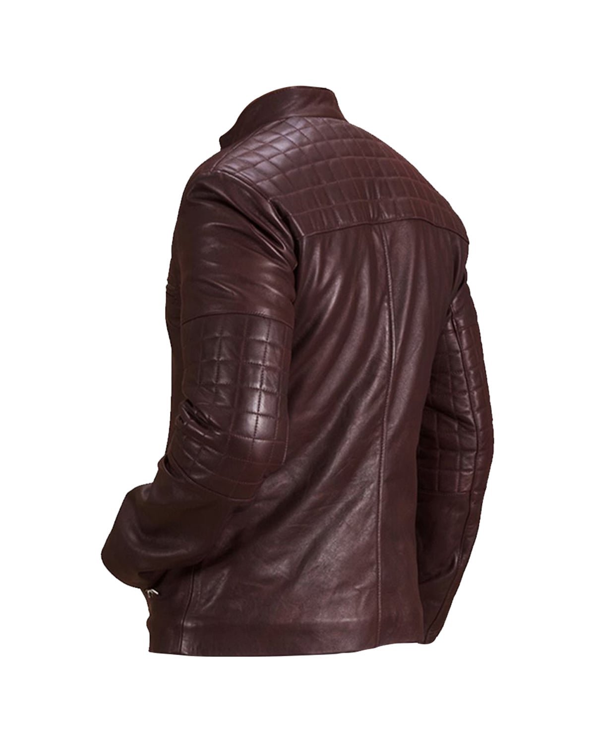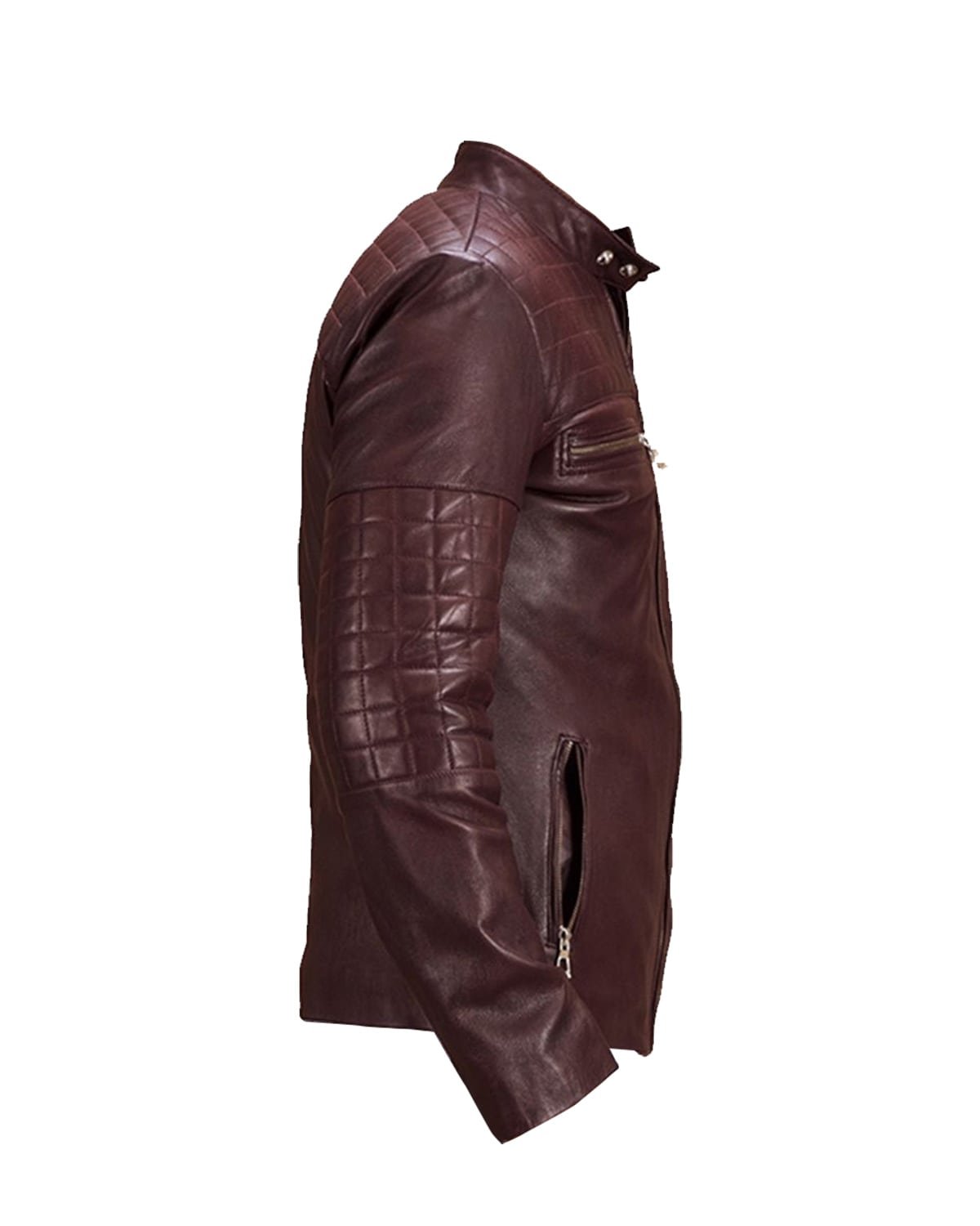 Diese Jacke besticht durch ihre markante **weinrote Farbe und die präzise Rautensteppung** an Schultern und Ärmeln, die ihren Look von robust zu raffiniert hebt. Der elegante **Stehkragen mit doppeltem Druckknopfverschluss** verleiht der Jacke eine einzigartige, raffinierte Note und hebt sie von herkömmlichen Bikerjacken ab.