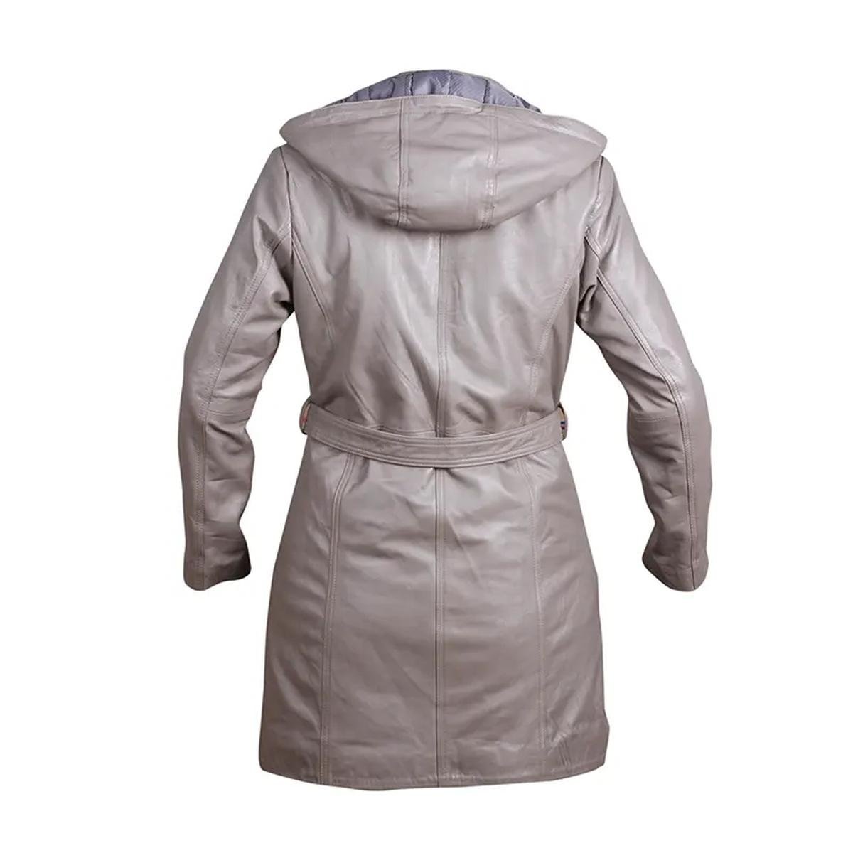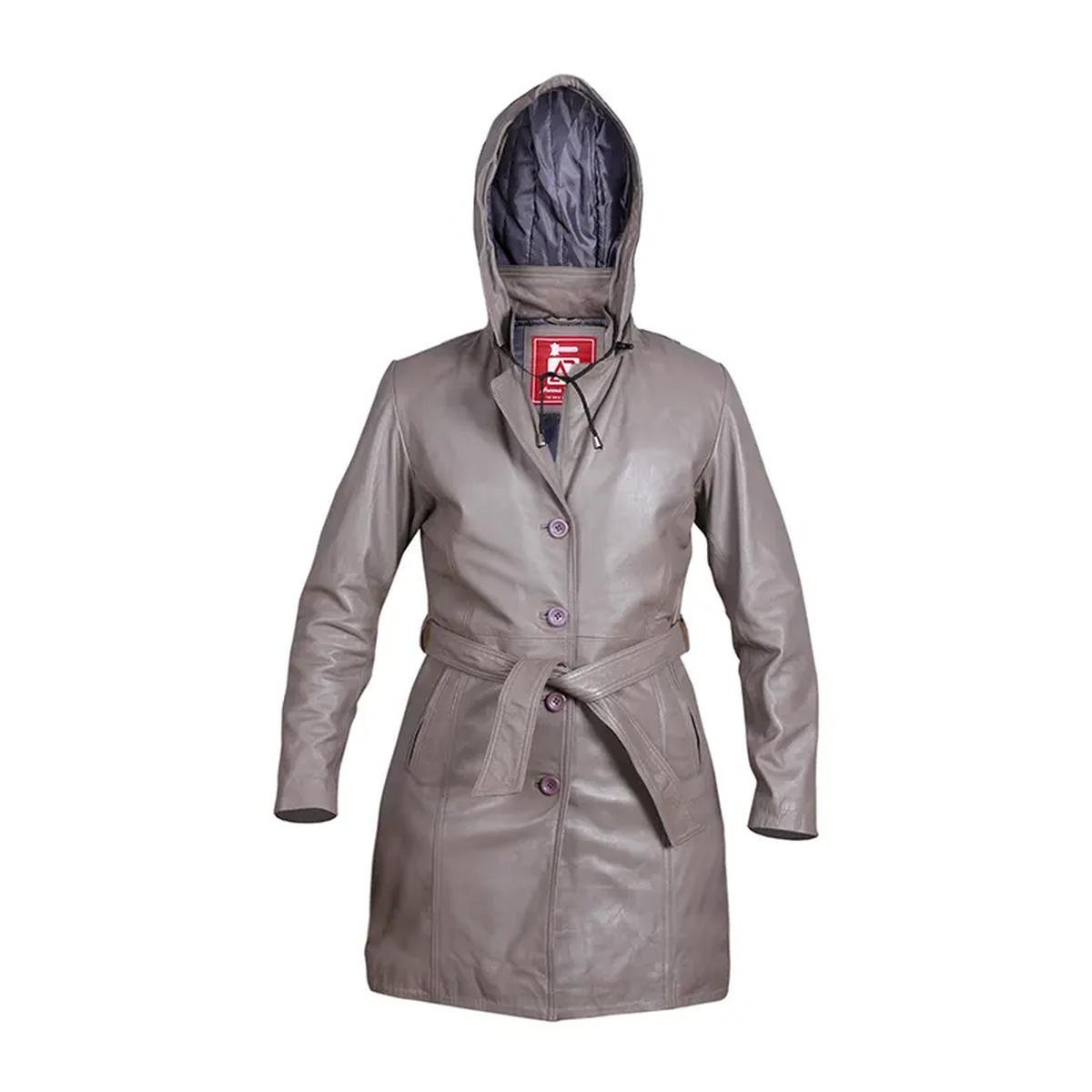 Grauer Damen-Ledermantel mit Kapuze Gürtel