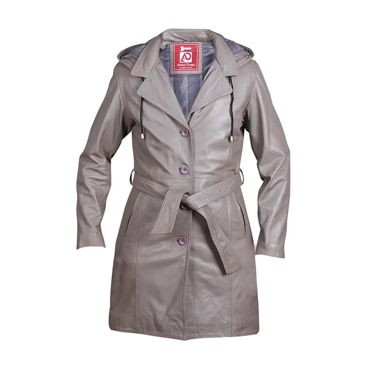 Legen Sie Ihren handgefertigten grauen Damen-Ledermantel mit Kapuze noch heute in den Warenkorb!