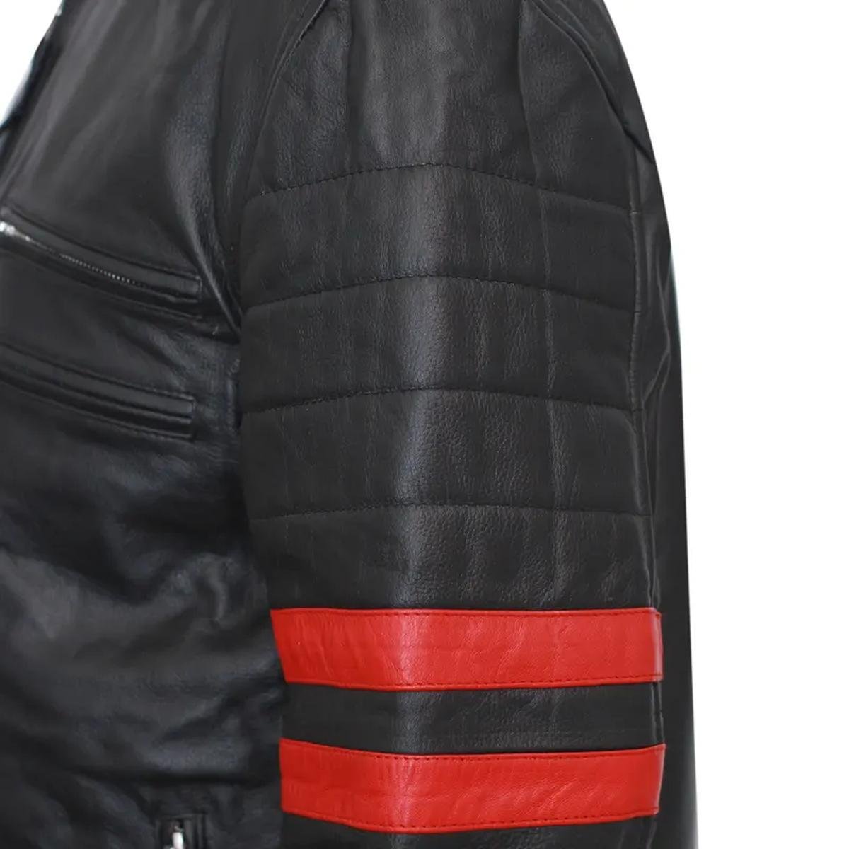 Diese Jacke aus hochwertigem, echtem Schafsleder verkörpert Stil und Attitüde. Mit ihrem markanten schwarzen Finish, akzentuiert durch kräftige rote Streifen an den Oberarmen, ist sie für alle entworfen, die es wagen, aufzufallen. Die schmal geschnittene Silhouette sorgt für einen modernen, schmeichelhaften Look, der perfekt ist, um ein Statement zu setzen.