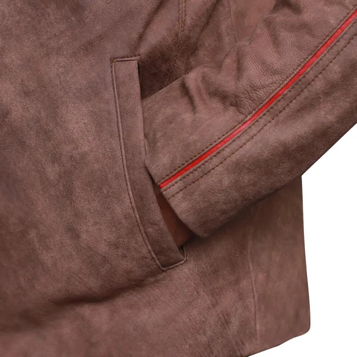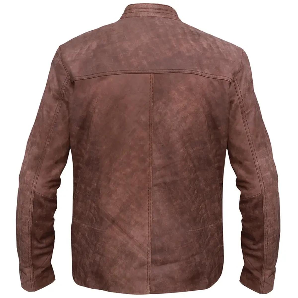 Die einzigartige, leicht abgenutzte hellbraune Oberfläche verleiht der Jacke vom ersten Tag an einen robusten, getragenen Charakter und hebt sie von gewöhnlichen Lederjacken ab. Der Stehkragen mit Druckknopfverschluss verleiht einen Hauch von klassischem Cafe-Racer-Charme.