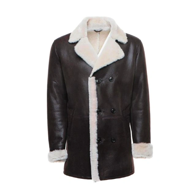 Der **Stil des zweireihigen Mantels** hat seinen Ursprung in den Militäruniformen des 19. Jahrhunderts, insbesondere in den Marine-Peacoats und -Greatcoats, die für ihre hervorragende Wärme und ihre imposante Silhouette geschätzt wurden. In die zivile Mode übernommen, wurde er zu einem Markenzeichen anspruchsvoller Herrenmode und signalisierte Macht und Eleganz. Gleichzeitig wird **Shearling**, das natürliche Fell von Lamm oder Schaf mit intakter Wolle, seit Jahrhunderten wegen seiner außergewöhnlichen Isoliereigenschaften geschätzt und schützte bekanntermaßen Flieger in offenen Cockpits und Pioniere in rauen Umgebungen.