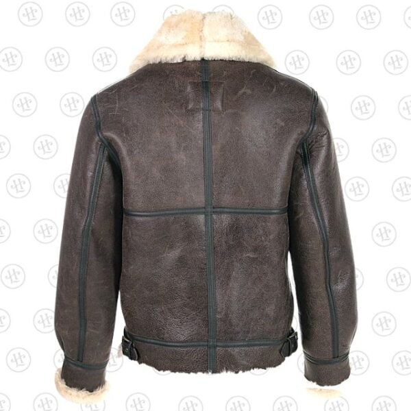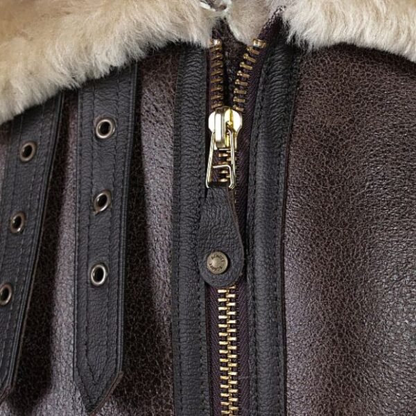 Diese Jacke ist aus hochwertigem, genarbtem, dunkelbraunem Schaffell gefertigt und mit weichem, cremefarbenem Kunstfell gefüttert. Sie bietet maximale Wärme und einen unverwechselbar klassischen Look. Mit einem robusten YKK-Reißverschluss und praktischen Schnallenverstellungen ist es eine Investition in zeitlosen Stil und Komfort.