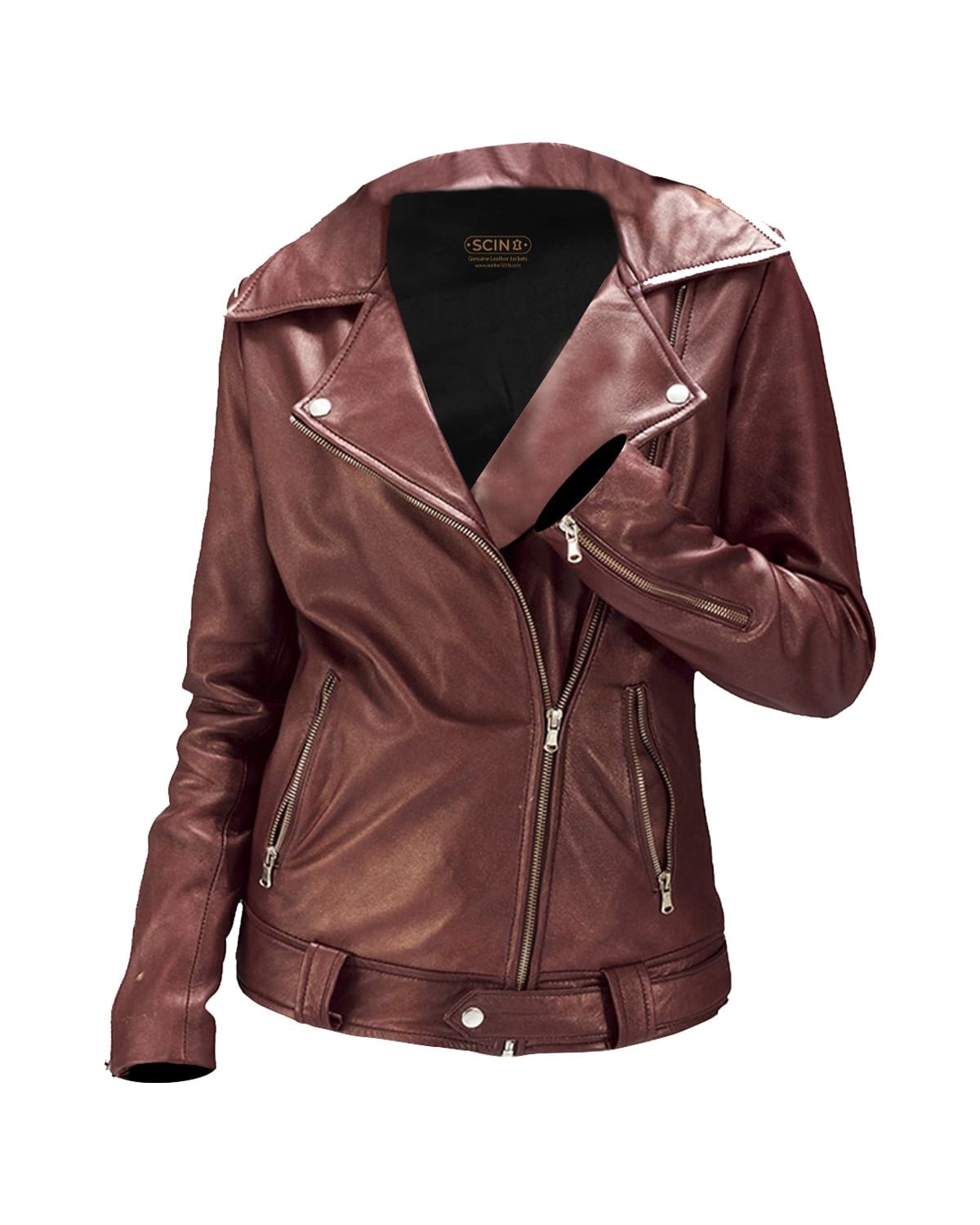 Der satte, kastanienbraune Farbton des hochwertigen Schafsleders verleiht der klassischen Biker-Silhouette eine besondere Note und sorgt für eine gelungene Balance aus Eleganz und rebellischem Flair.