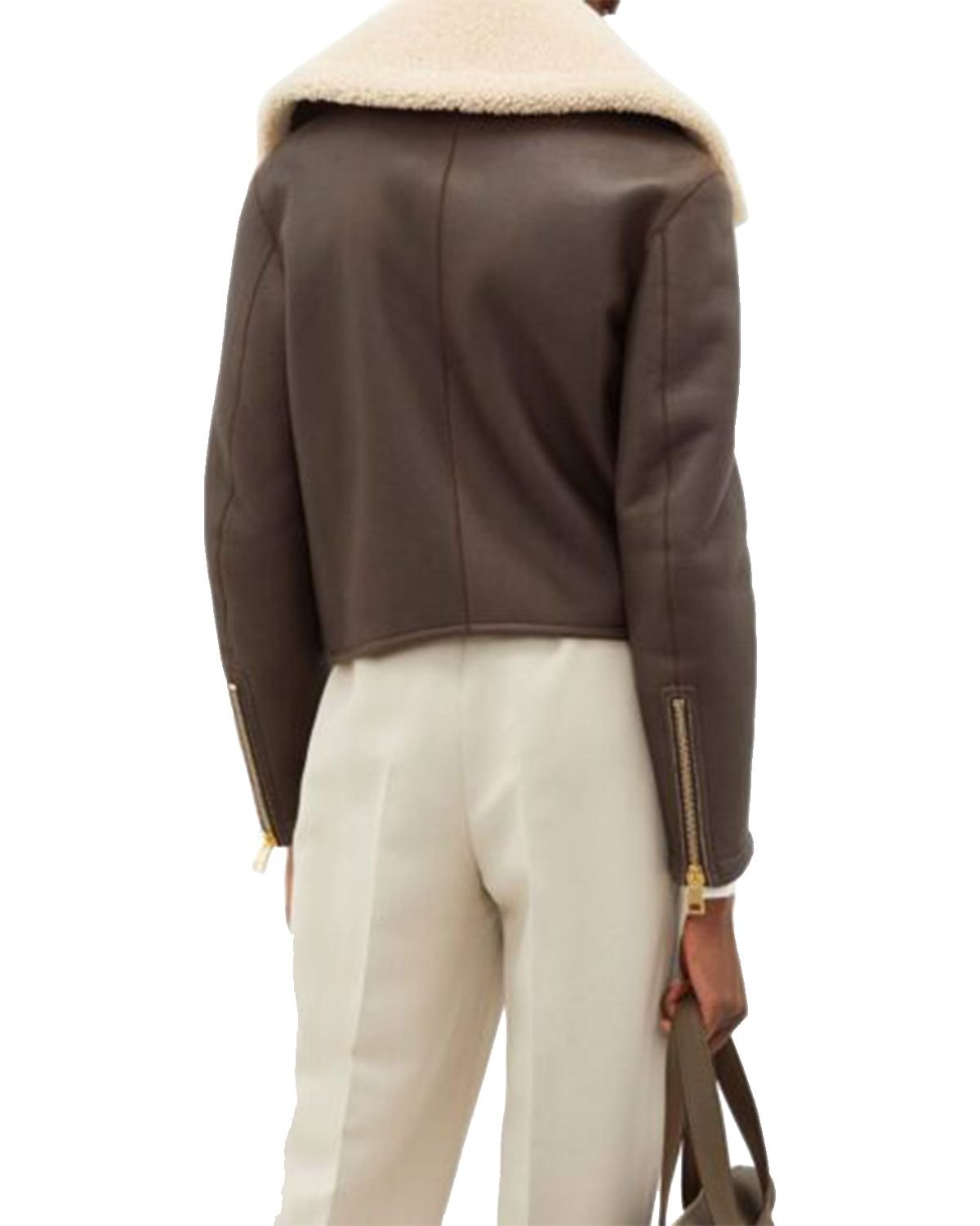 Die Lana Bikerjacke, gefertigt aus feinstem Echtleder in einem satten Schokoladenbraun, ist ein echtes Statement. Die makellose Verarbeitung und die robuste Konstruktion versprechen Langlebigkeit, während das luxuriöse Kunstfell-Innenfutter und der Reverskragen für außergewöhnliche Wärme und Komfort sorgen und beweisen, dass kühner Stil auch gemütlich sein kann.