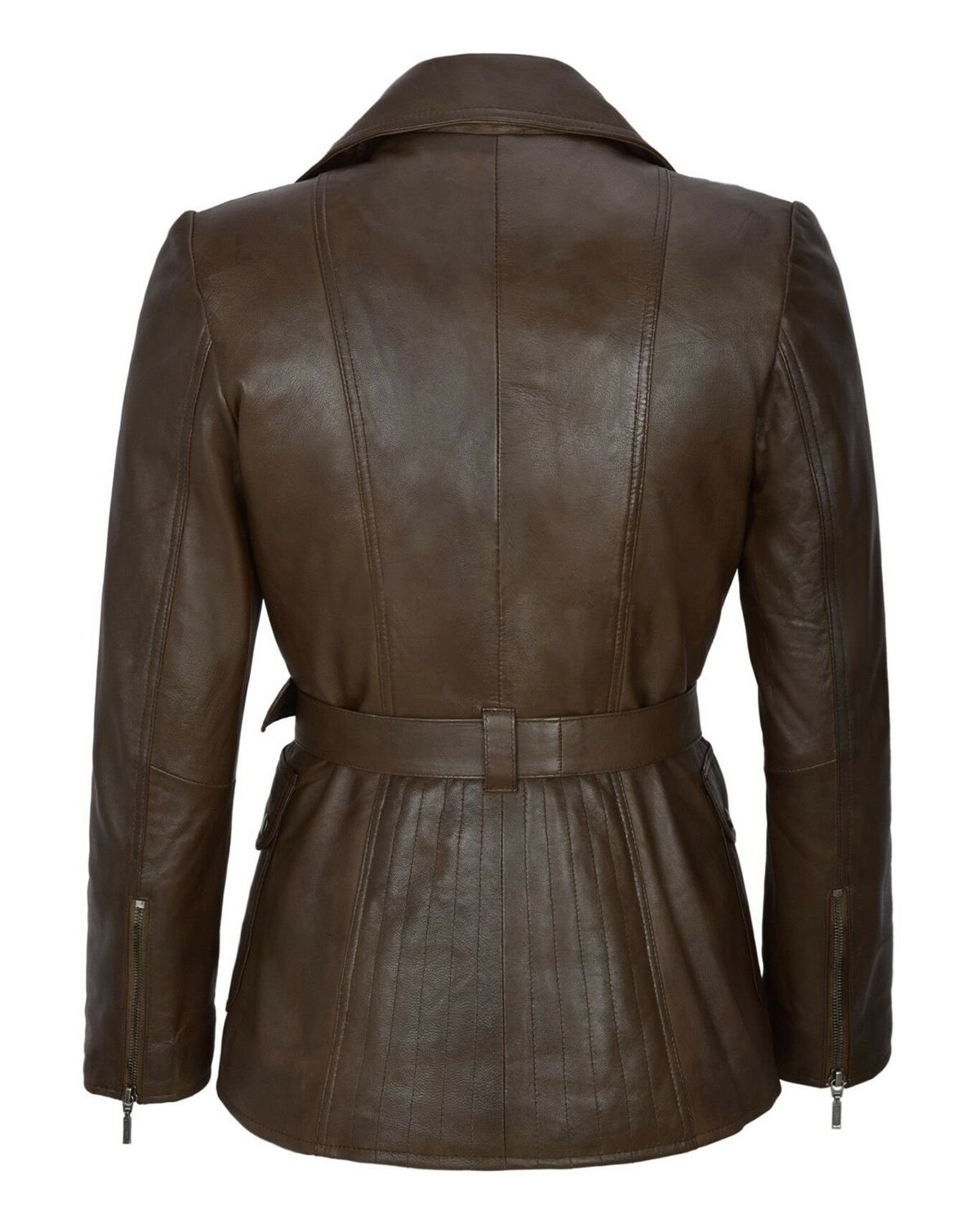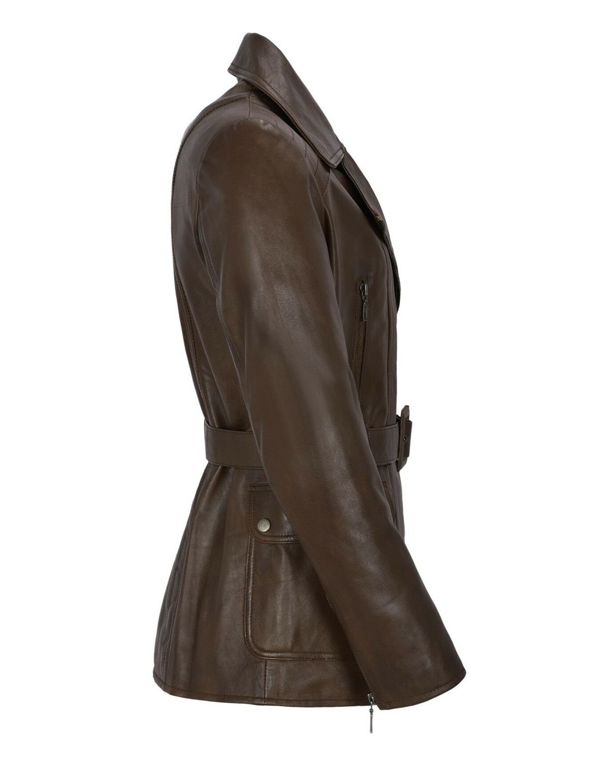 Mit dem Lyra Classic Leder-Trenchcoat setzen Sie ein unvergleichliches modisches Statement. Dieser Mantel aus hochwertigem Echtleder in einem satten Braunton bietet ein luxuriöses Tragegefühl und eine schmeichelhafte, taillierte Silhouette. Seine makellosen Details und die erstklassige Verarbeitung machen es zu einem vielseitigen Basic, das sich mühelos mit Hosen, Jeans oder Stoffhosen für jeden Anlass kombinieren lässt.