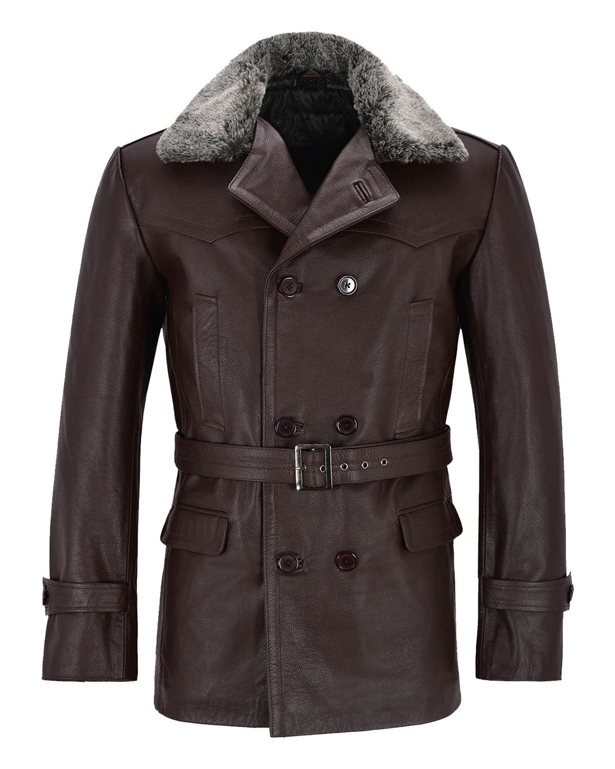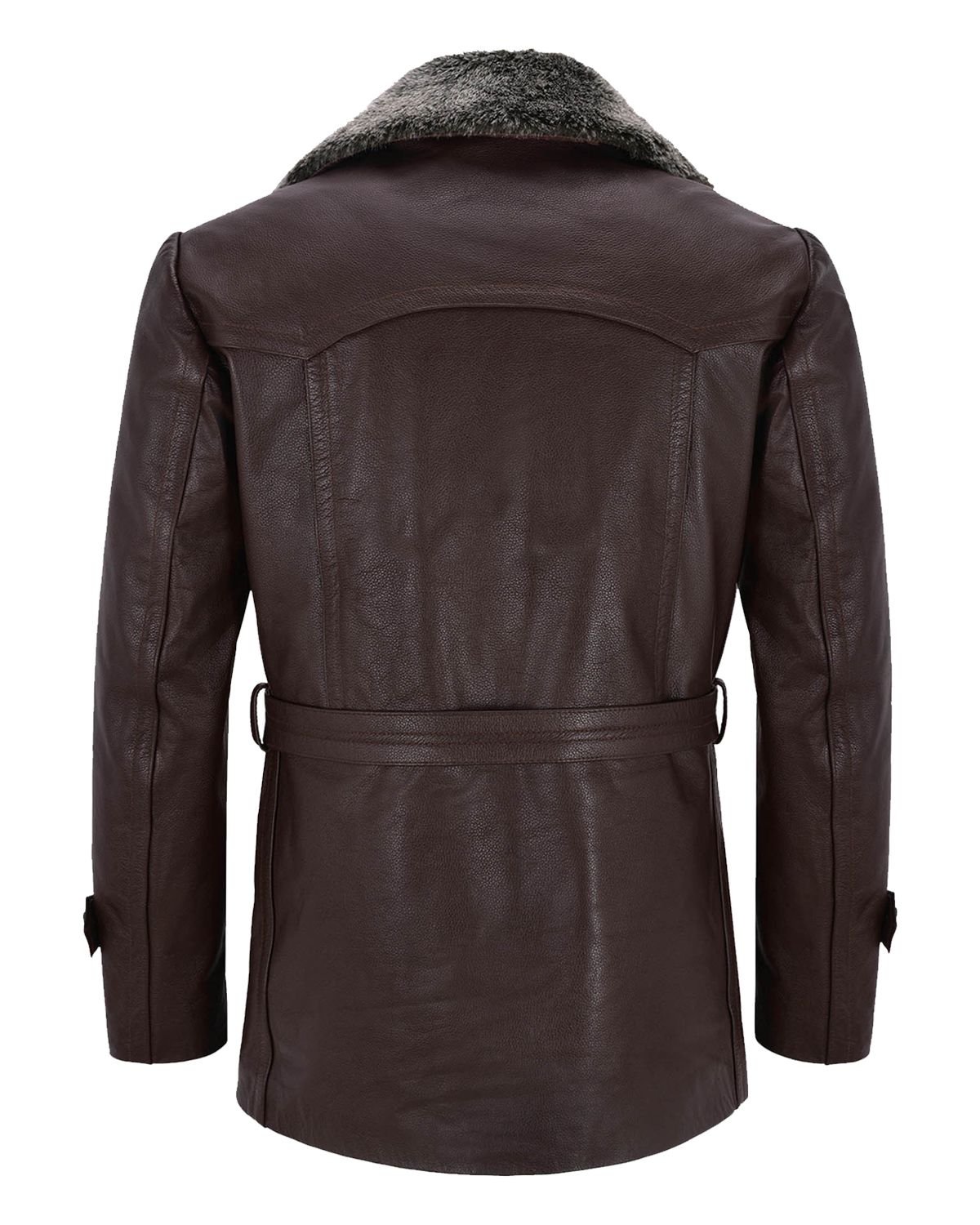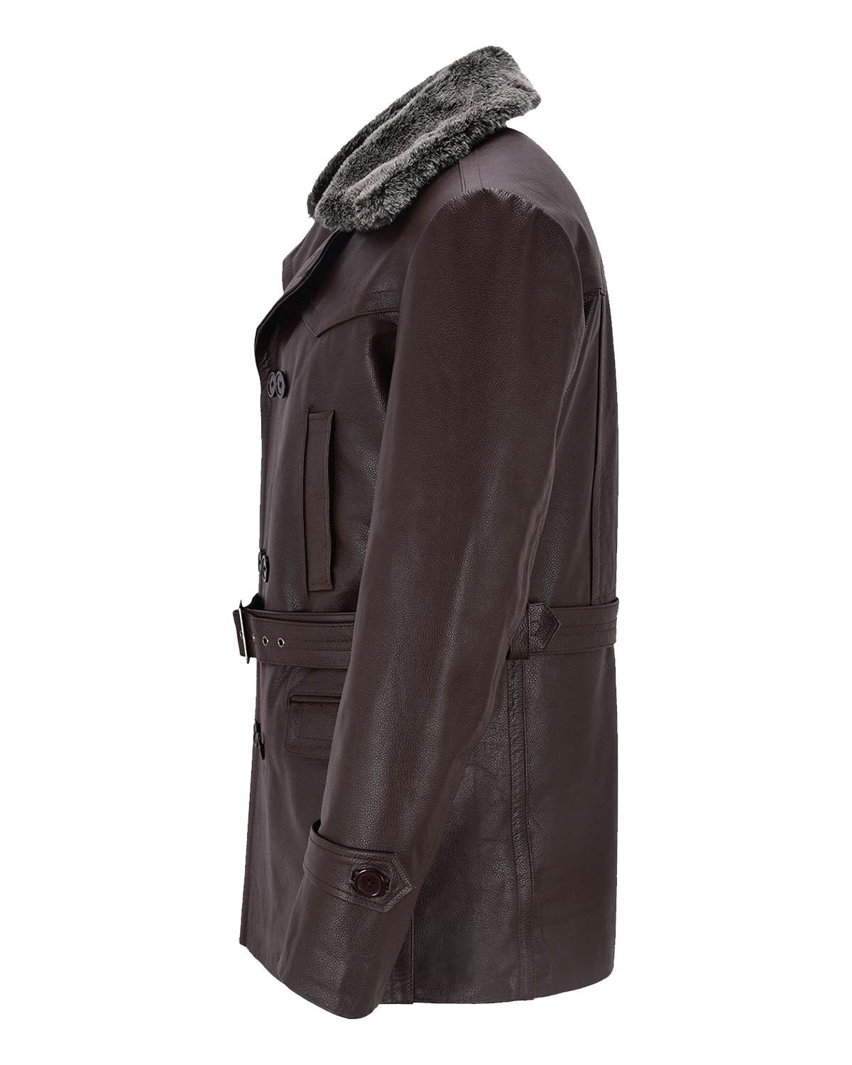 Dieser Cabanmantel aus feinstem Echtleder in einem satten Dunkelbraun vereint makellosen Stil mit höchstem Tragekomfort. Mit seinem luxuriösen Pelzkragen und der klassischen doppelreihigen Knopfleiste bietet er hervorragende Wärmeisolation und betont gleichzeitig Ihre Silhouette. Ein verstellbarer Ledergürtel sorgt für eine individuelle Passform und macht das Kleidungsstück vielseitig für jeden Anlass.