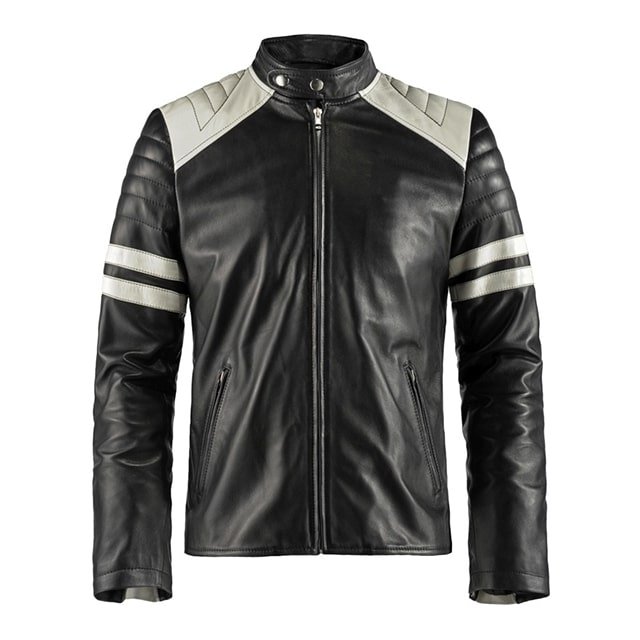 Mit markanten grauen Ärmelstreifen, Gesteppte Schultern und kunstvoll genähte Armausschnitte unterstreichen den Retro-Motorrad-Charme.