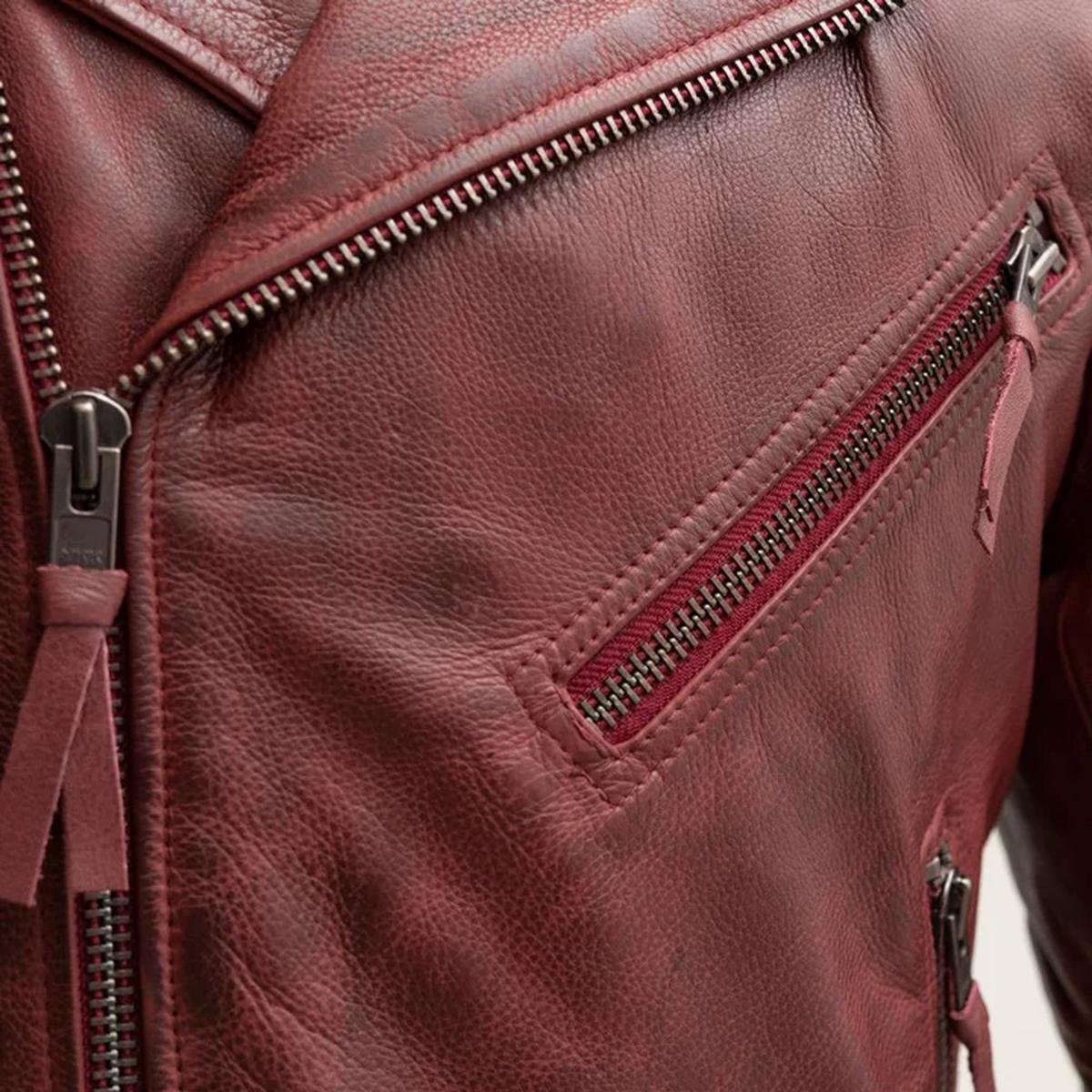 Verleihen Sie Ihrem Stil mit unserer **Herren-Motorradjacke aus Lammleder** in einem faszinierenden Bordeauxrot das gewisse Etwas. Gefertigt aus geschmeidigem, echtem Lammleder, bietet diese Jacke nicht nur eine edle, raffinierte Optik, sondern auch die luxuriöse Wärme eines echten Shearling-Futters. Es wurde für den modernen Mann entworfen, der zeitlose Eleganz und außergewöhnlichen Komfort für jeden Anlass verlangt.