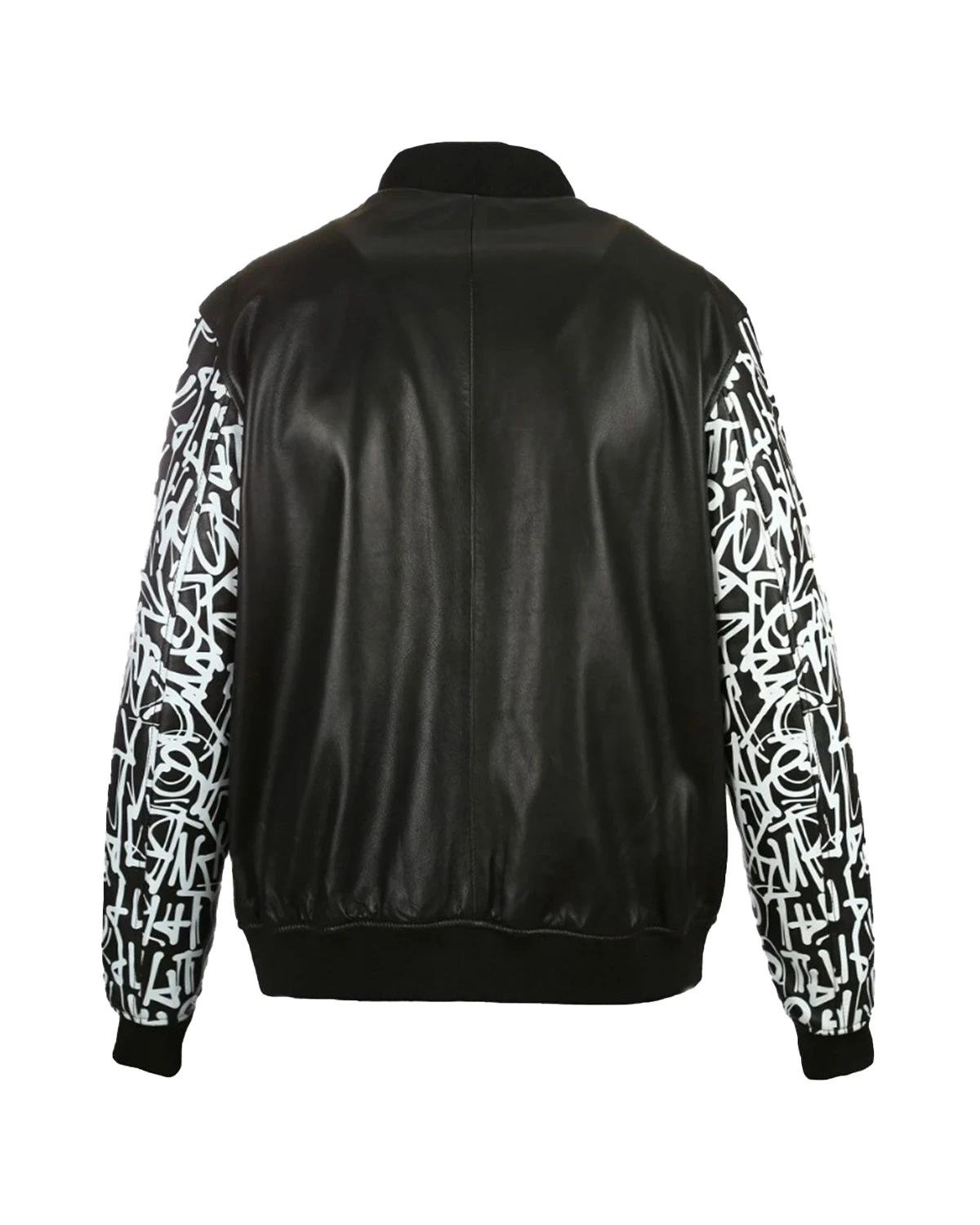 Heben Sie sich mit einzigartigen, cremefarbenen Lammfellärmeln mit einem auffälligen schwarzen Grafikprint ab, die der klassischen College-Silhouette eine trendige und moderne Note verleihen.