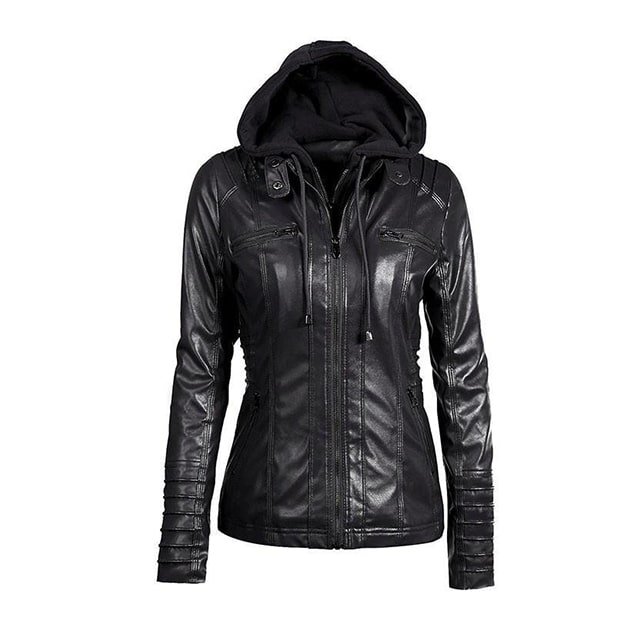 Lege diese handgefertigte schwarze Designer-Motorradlederjacke mit Kapuze für Damen noch heute in deinen Warenkorb!