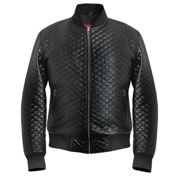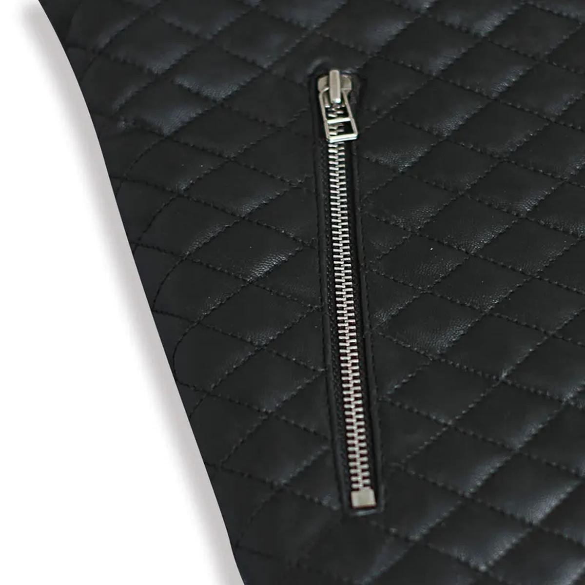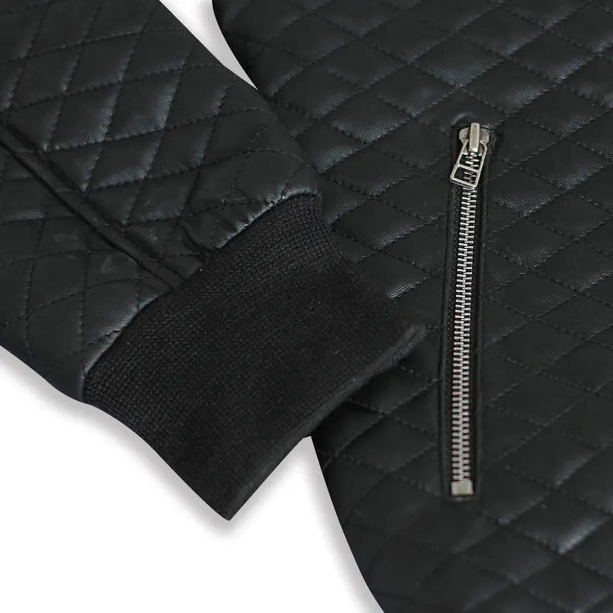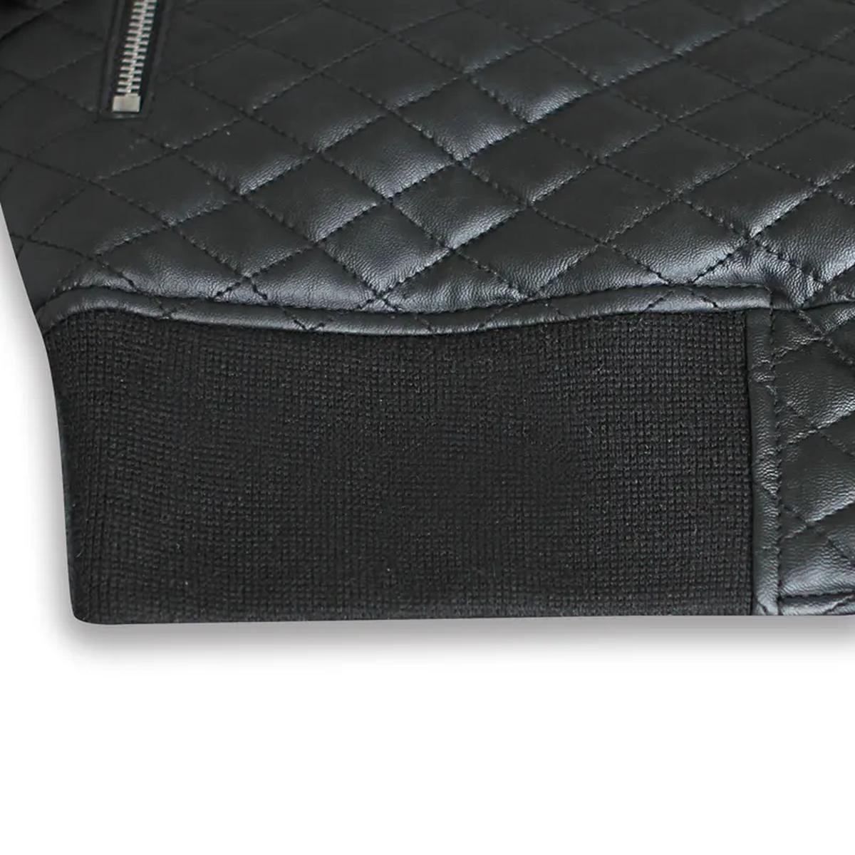 Diese rautenförmig gesteppte Motorrad-Bomberjacke aus 100 % echtem Leder mit elegantem schwarzem Finish verleiht jedem Anlass eine umwerfende und strahlende Ausstrahlung. Ihre robuste Verarbeitung garantiert Langlebigkeit, während das weiche Viskosefutter für außergewöhnlichen Tragekomfort sorgt. Mit einem klassischen Frontreißverschluss und traditionellen Rippstrickbündchen an Ärmeln und Saum bietet es maximalen Tragekomfort und eine zeitlose Passform.