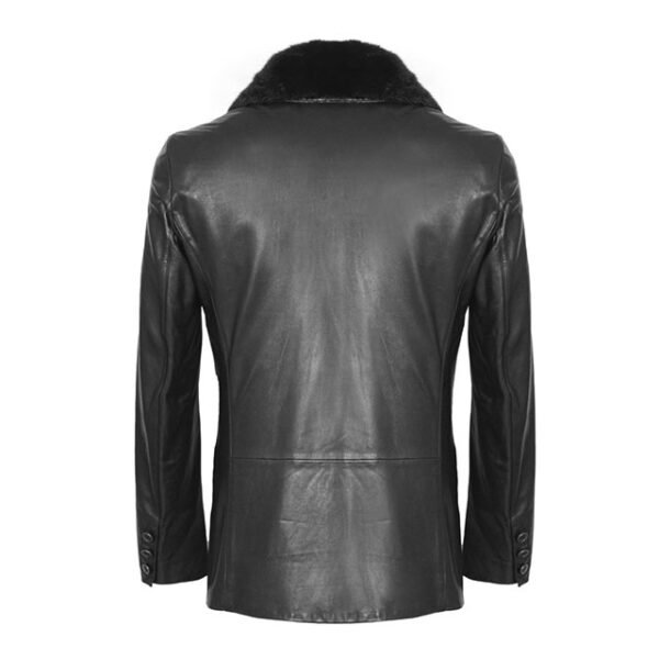 Schwarzer, doppelreihiger Lederpullover für Herren mit Shearling-Besatz. Mantel