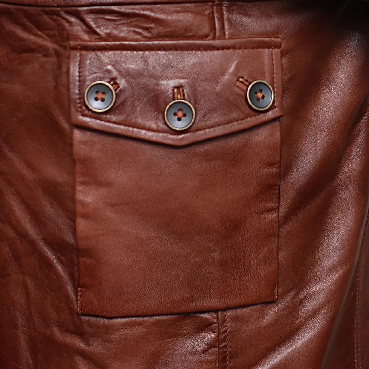 Dieser Trenchcoat aus hochwertigem Echtleder mit markanter Used-Optik bietet nicht nur außergewöhnliche Wärme und Schutz vor den Elementen, sondern strahlt auch eine unvergleichliche Aura von roher Kraft und raffinierter Eleganz aus. Mit einer robusten Knopfleiste und markanten Shearling-Futterelementen bietet sie eine zeitlose Passform, die ebenso beeindruckend wie komfortabel ist.