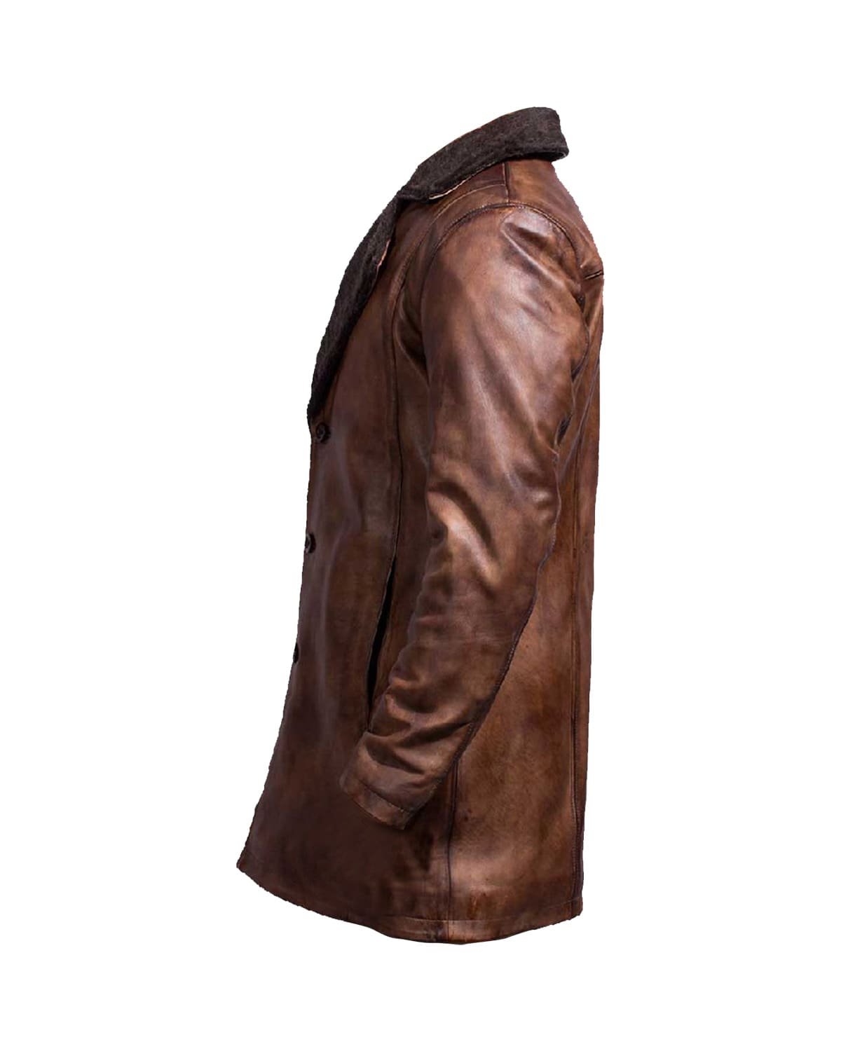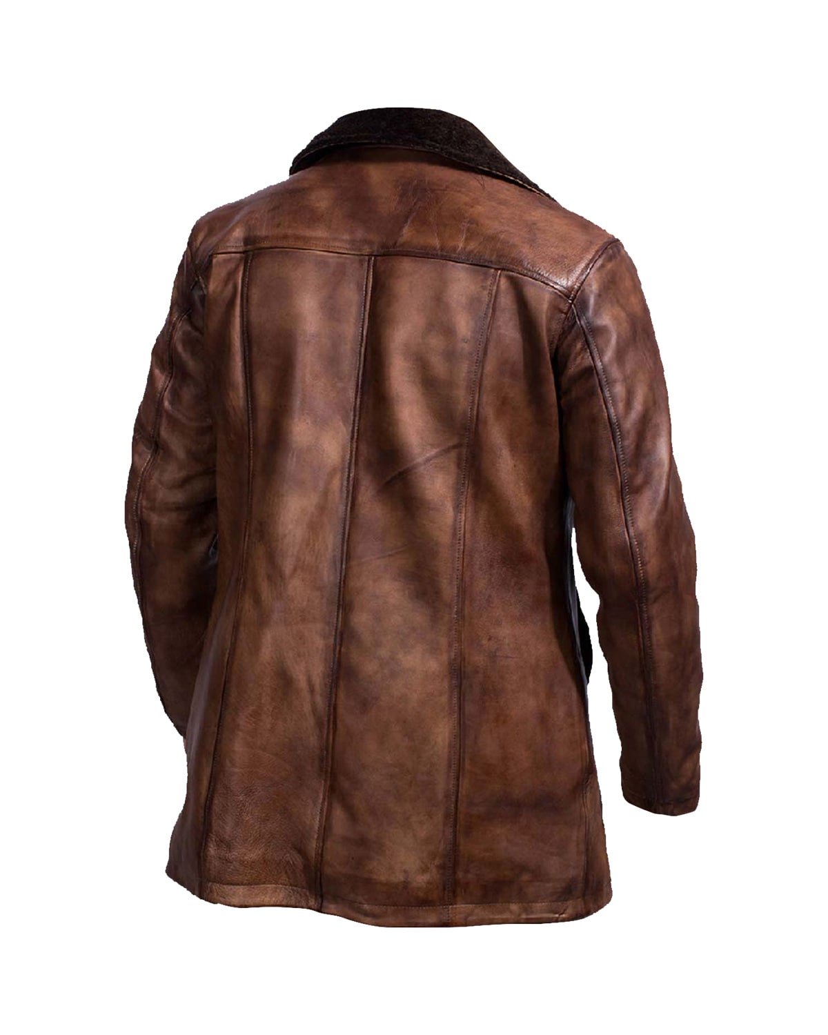 Dieser Mantel ist aus hochwertigem Echtleder gefertigt und besticht durch sein faszinierendes, gealtertes Braun-Finish. Das Futter aus luxuriös weichem Kunstfell sorgt für außergewöhnliche Wärme und Komfort. Der klassische Knopfverschluss, der elegante Reverskragen und die offenen Saumbündchen definieren eine Silhouette, die zeitlos und mühelos stilvoll ist.